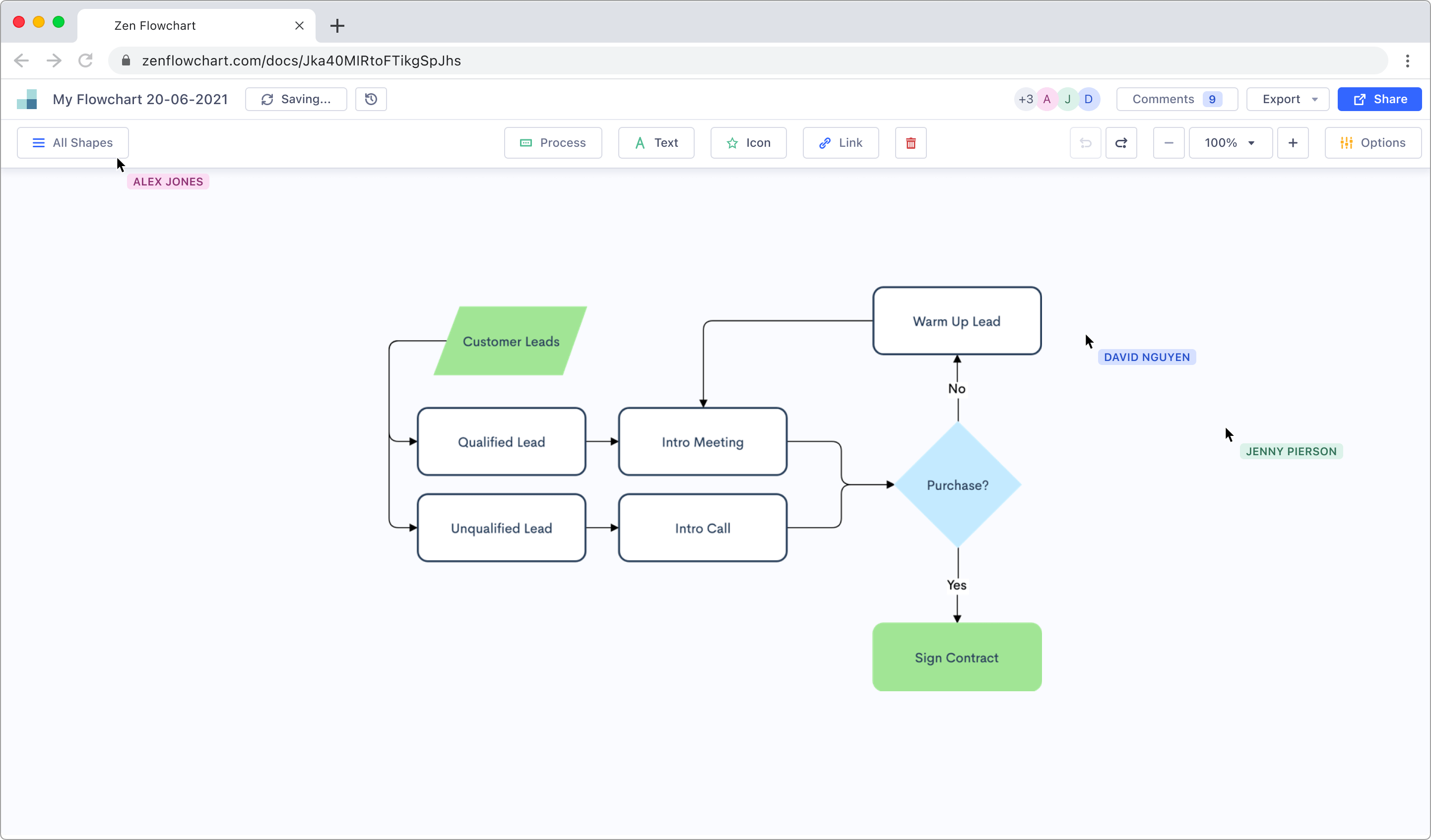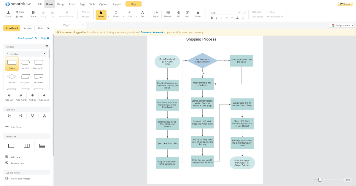 Один из самых популярных сервисов для работы с блок-схемами. Здесь вас ждёт очень простой и понятный интерфейс. Есть интеграция со сторонними сервисами (к примеру, Slack, Microsoft Teams, Google Диск, Jive). Также поддерживается совместная и офлайн работа. Можно выбрать один из сотен шаблонов, подходящих для вашей задачи.