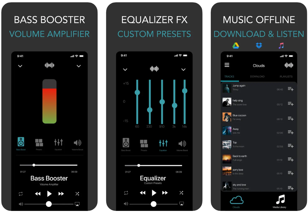 Приложение во многом похоже на Equalizer+, но с парой важных отличий. Есть бустер объёмного баса и набор предустановок. Конечно, можно создавать и свои настройки. Эквалайзер пятиполосный. Bass Booster 3D работает только с треками без DRM-защиты.