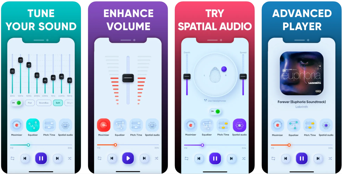 У приложения один из самых крутых интерфейсов, что позволяет быстро разобраться в нём. Можно управлять максимальной громкостью, эквалайзером, частотами и пространственным аудио.