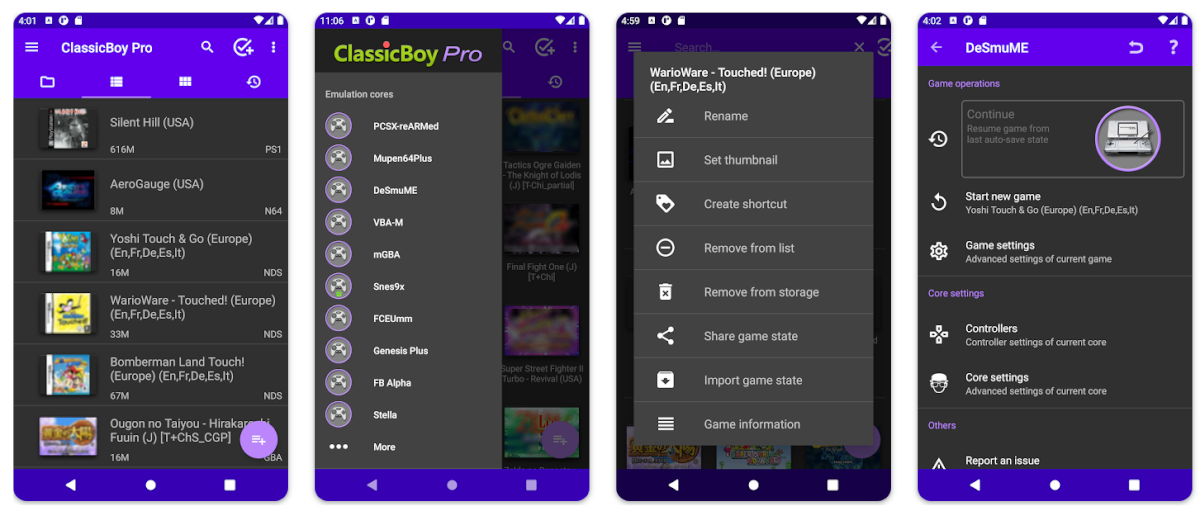 Если вы пользовались RetroArch, здесь всё будет знакомо и привычно. Эмуляция происходит с помощью установки ядер. Интерфейс более дружелюбный и понятный. Есть поддержка физических контроллеров, сейв-стейтов, читов и прочего.
