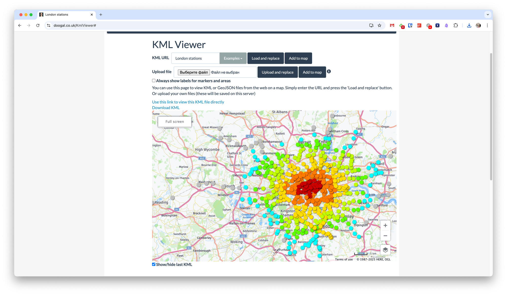 Doogal KML Viewer — инструмент для просмотра, анализа и работы с файлами KML. Есть интеграция с OpenStreetMap и Google Maps, возможность изучения геометрии маршрутов и областей.