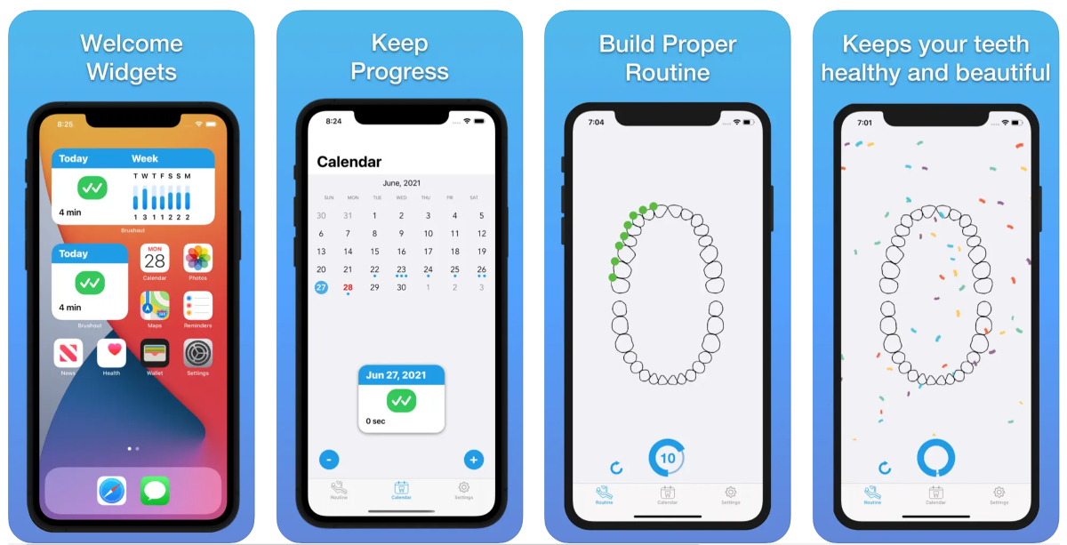 Есть календарь для отслеживания чисток зубов и напоминалки. В бесплатной версии есть голосовой помощник, который говорит, когда нужно перейти на другую полосу зубов. В платной версии (от $0.99) появляются различные дополнительные настройки и цветовые схемы.
