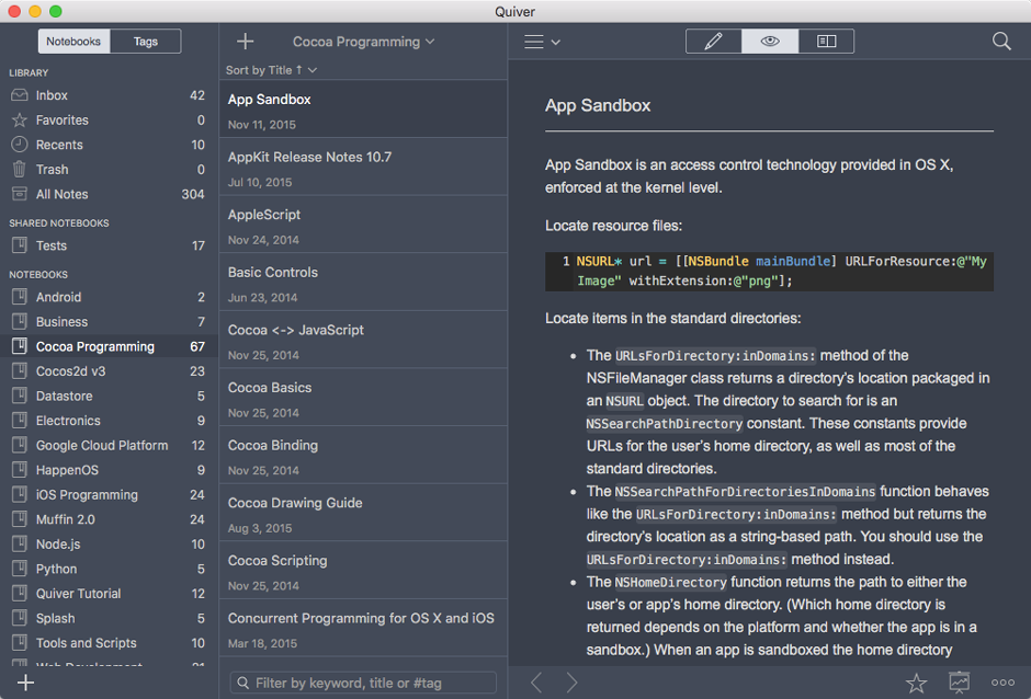 Это приложение подойдёт тем, кто любит смешивать различные форматы в одной заметке. Quiver позволяет одновременно работать с Markdown и LaTeX, а также здесь есть встроенный редактор кода.