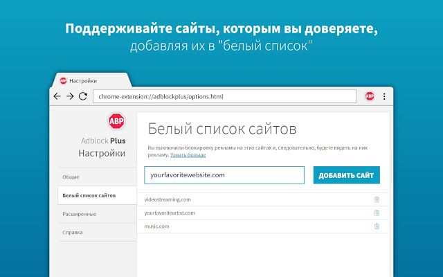 Очень важно, что AdBlock даёт возможность создать белый список сайтов, которым вы доверяете. Тем самым он обеспечивает комфортную и безопасную среду для работы в интернете.