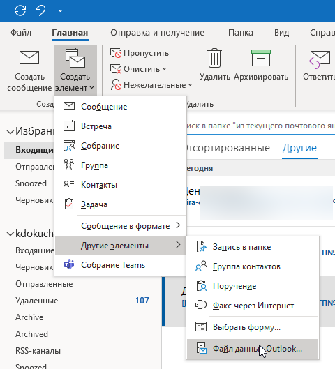 Для этого в разделе Главная нажмите кнопку Создать Элемент, выберите Другие Элементы > Файл данных Outlook.