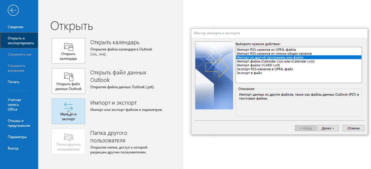 Теперь откройте меню Файл > Открыть и экспортировать > Импорт и экспорт. В появившемся окне выберите Импорт из другой программы или файла.