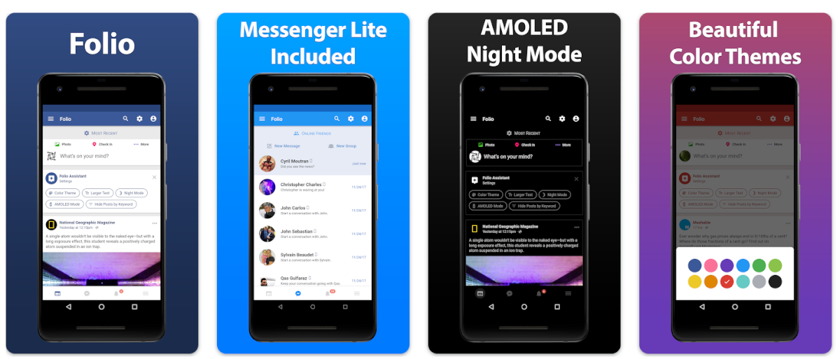 Удобное решение для работы с ФБ, которое не так жрёт батарею телефона, как официальная приложуха. Из фишек — ночной режим с поддержкой AMOLED, возможность поменять цвет оформления, есть раздел Избранное для быстрого перехода к часто используемым менюшкам. Также можно защитить вход в аккаунт с помощью четырёхзначного PIN-кода.