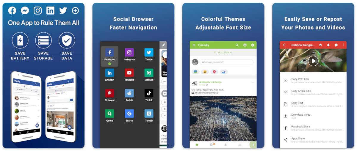 Недавно появившийся клиент Facebook, который также работает с LinkedIn, Twitter, Instagram и другими площадками. Есть поддержка Facebook Messenger, возможность настроить под себя тему оформления и ленту новостей. Также можно скачивать видео из Facebook.
