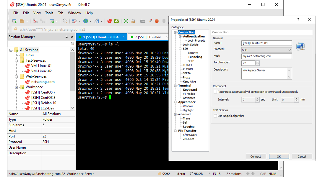 Утилита бесплатна для некоммерческого использования, а платная версия начинается от $99. Как и у аналогов, в Xshell есть возможность работы с вкладками. А ещё можно запускать несколько окон в одном интерфейсе.