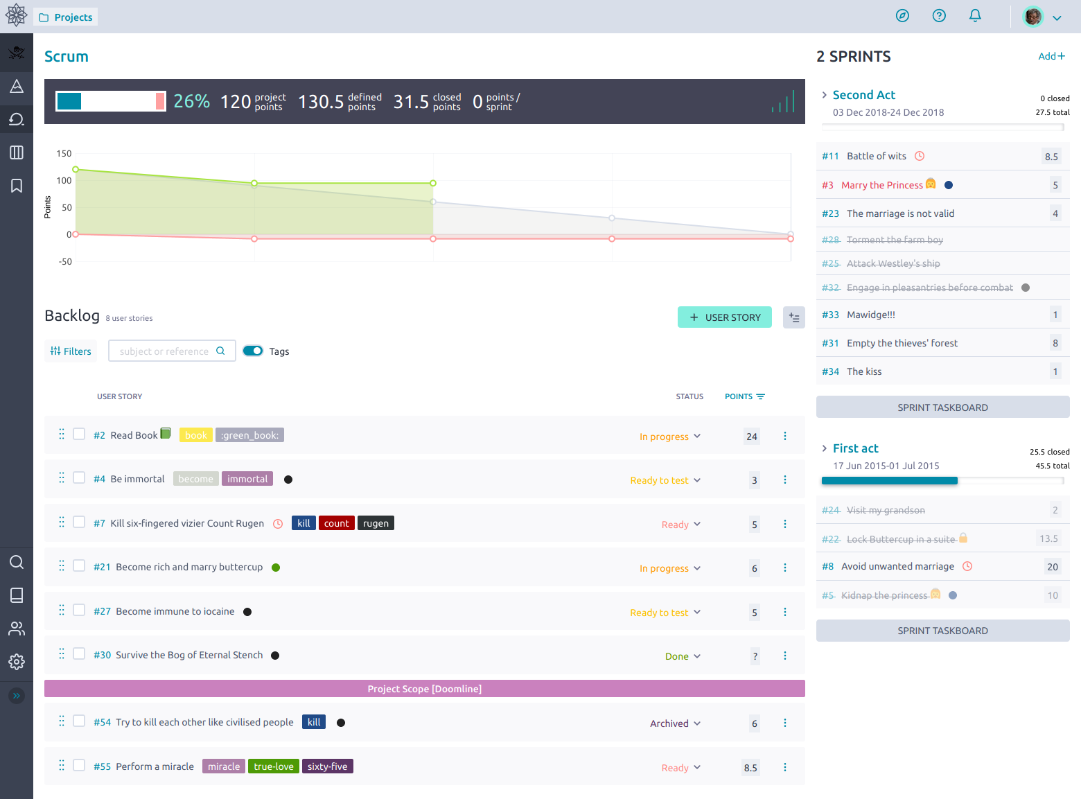 Taiga — приложение для управления задачами и проектами с функциональностью Agile, которое позволяет пользователям создавать, организовывать и отслеживать задачи и проекты с помощью Kanban-досок, диаграммы Ганта и бэклога. Оно доступно как в облачной версии, так и для установки на сервере. Также можно создавать пользовательские поля и метки для более детальной организации задач.