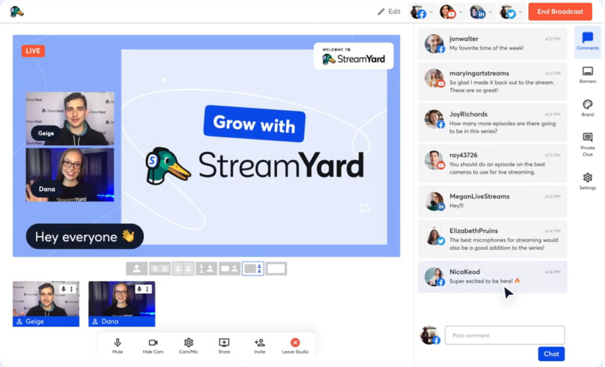 Это студия для ведения живых эфиров прямо в браузере. Можно проводить интервью с гостями, записывать экран и многое другое. Поддерживаются одновременные прямые стримы на «Лицокнигу», YouTube, LinkedIn и другие популярные сайты.