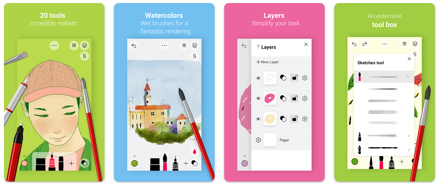 Как можно догадаться из названия, приложение позволяет рисовать скетчи. При этом вы можете сделать не просто чёрно-белый набросок, а полностью раскрасить его с помощью различных кистей.
