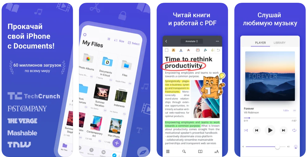 Это универсальный помощник в управлении файлами на вашем iPhone! Одно из самых рейтинговых приложений в App Store заменит множество инструментов. С ним вы сможете просматривать документы, открывать PDF-файлы, слушать музычку и смотреть видосики, загружать файлы и импортировать их из облака, архивировать/разархивировать сжатые файлы, пользоваться встроенными VPN и браузером… и много чего ещё.