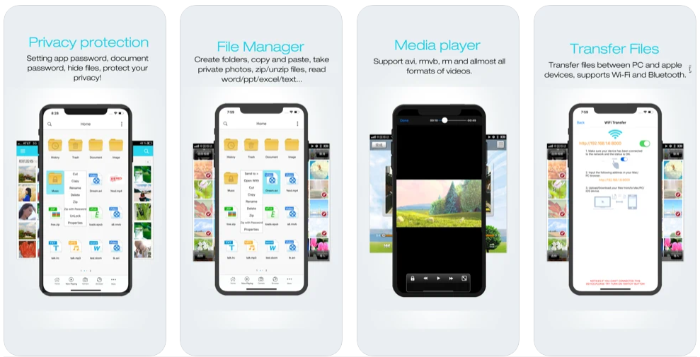 Приложение с говорящим за себя названием предназначено для просмотра изображений, аудио/видео, ZIP/RAR файлов, документов в формате PDF, Word, Excel и многого другого на вашем iPhone. Ещё вы сможете запаролить файлы, передавать файлы между ПК и Mac через Wi-Fi, делиться ими по email, блютуз и др.