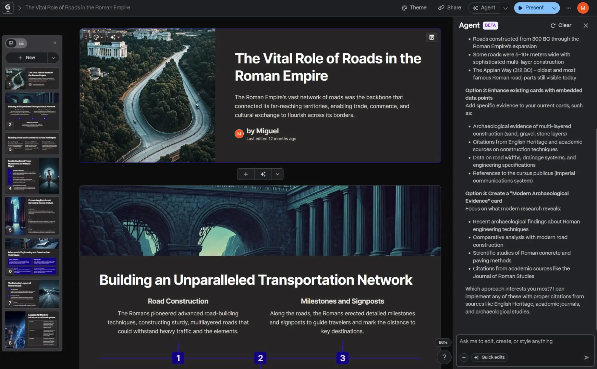 Ещё один сервис для создания красивых презентаций, отчётов и даже обычных рассказов. Процесс создания, как и во многих других сервисах, начинается с ввода промпта. После чего ИИ сгенерирует структурированные слайды и добавит уместный визуал. Вам останется лишь доработать готовый проект под себя.