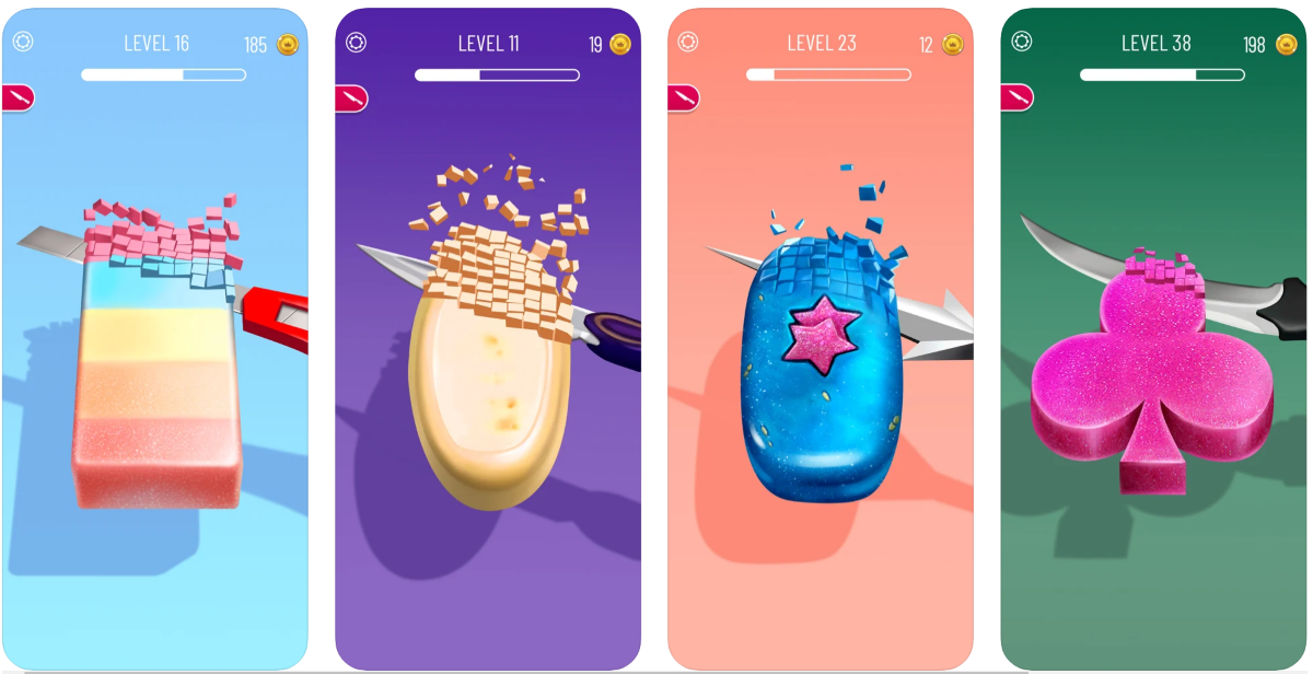 После еды следующим по популярности идёт звук нарезки мыла. В Soap Cutting вы будете заниматься именно этим, пытаясь придать красивую форму виртуальному куску мыла.