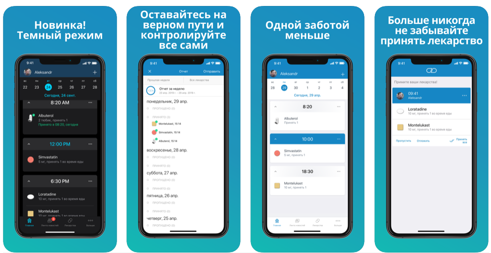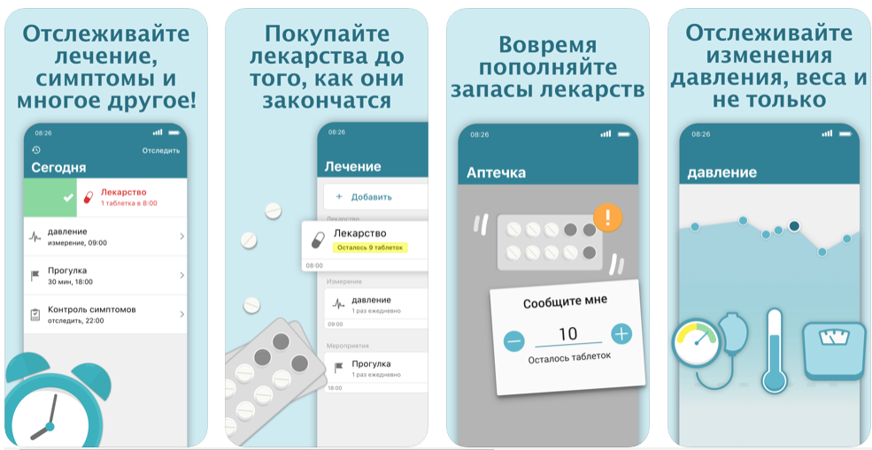 Эта программа является полным аналогомMedisafe. Она также определяет график приёма лекарств, сигнализирует о времени принятия таблеток. Основные показатели состояния организма также контролируются с помощью Medisafe.