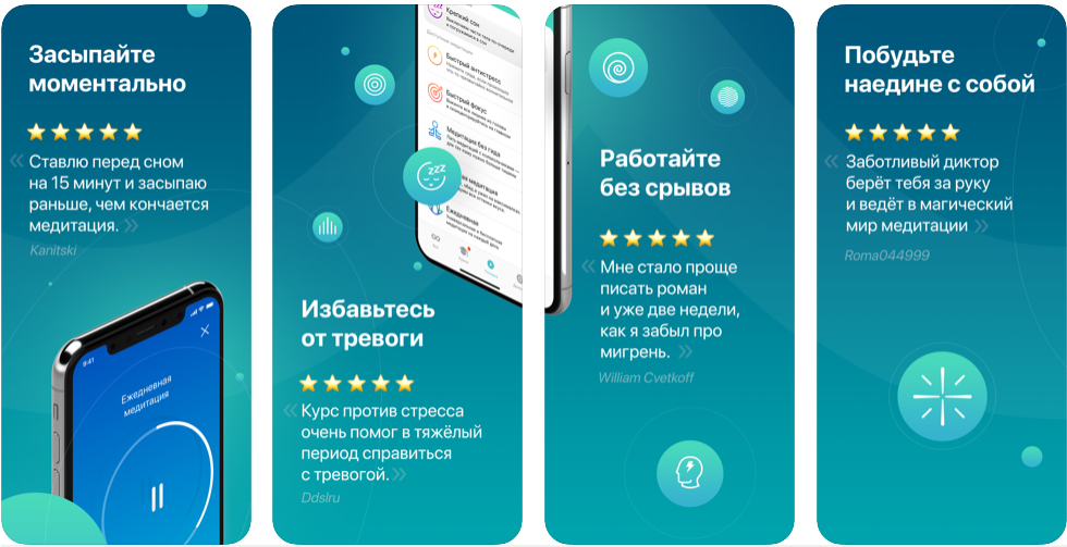 Большая корпорация, которая решила основательно заняться гигиеной сознания. Много специально выбранной музыки и немного практик. Персональный автоматизированный тренер на каждый день. Разделение по функциям: курсы против депрессии, бессонницы, против стресса, для работы, для детей и так далее. Есть таймер и статистика. Приятный современный дизайн приложений, фокус на звуках. Поддерживаются обе основные мобильные платформы. Из вероятных минусов: на инглише и требуют много денег — до 13 долларов в месяц.
