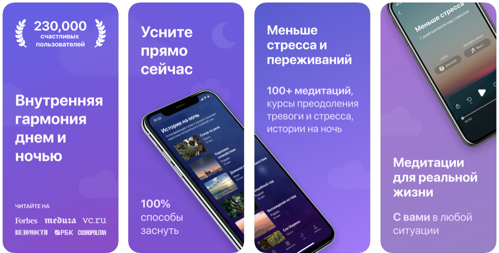 Тоже отечественный продукт, но с более приятным дизайном. Есть большая библиотека с аудио для медитации. Примерно 20 курсов, нацеленные на снижение стресса, улучшение осознанности. Есть отдельные курсы по счастью. Мне понравилось про «уснуть прямо сейчас», где ты слушаешь какой-то фоновый рассказ, который становится всё скучнее и скучнее. Я бы даже сказал, что приложение заточено лучше других на засыпание.