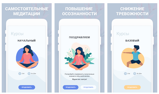 Тут уже пошли отечественные разработки в сфере медитативных практик. «Практика» нацелена на практическую часть. Можно легко подстроить под себя. Есть курсы, есть специальные разделы для сна и снижения стресса. Дизайн не очень красивый, но функциональный.
