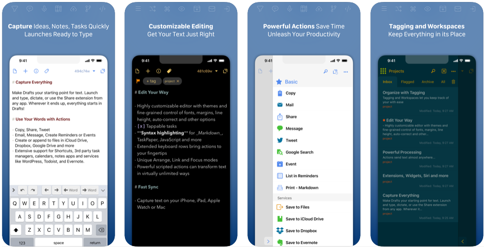 Кроме того, вы можете использовать Drafts для: поиска в Google; создания нового напоминания; сохранения в сторонних облачных сервисах, таких как OneDrive или Dropbox; создания твитов или задач в сторонних приложениях, таких как Things и OmniFocus. Drafts — это не только приложение для создания заметок, но и расширение, которое прекрасно работает с некоторыми другими крупными «игроками», такими как OneNote и Evernote.