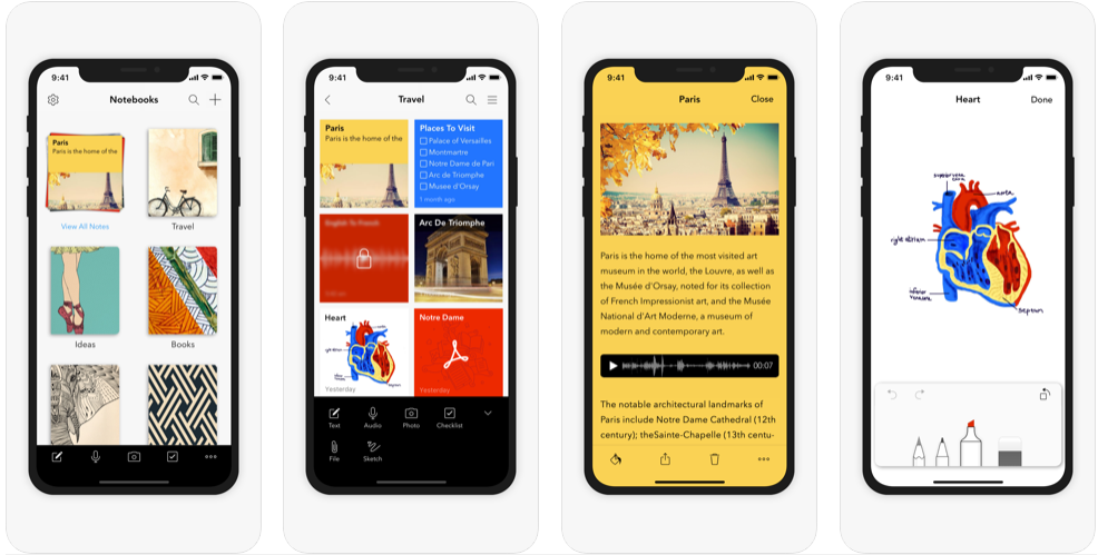 Приложение позволяет вам делать простые текстовые заметки. Вы можете захватывать эскизы и рукописные записи, аудиозаписи, изображения с камеры вашего устройства или из приложения «Фотографии». Также возможна любая комбинация всего вышеперечисленного.