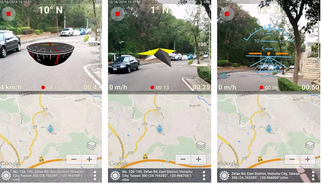 При помощи камеры вашего устройства программа отобразит на экране 3D-карту, компас, координаты, скорость, адрес и время. Кстати, карты здесь обновляются в режиме реального времени.