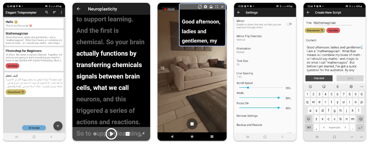 Одно из самых простых приложений в этой подборке. Кроме обычной прокрутки текста, здесь есть поддержка удалённого управления по Bluetooth, изменение размера текста, скорости прокрутки и многое другое. Можно вести запись одновременно с работой суфлёра.