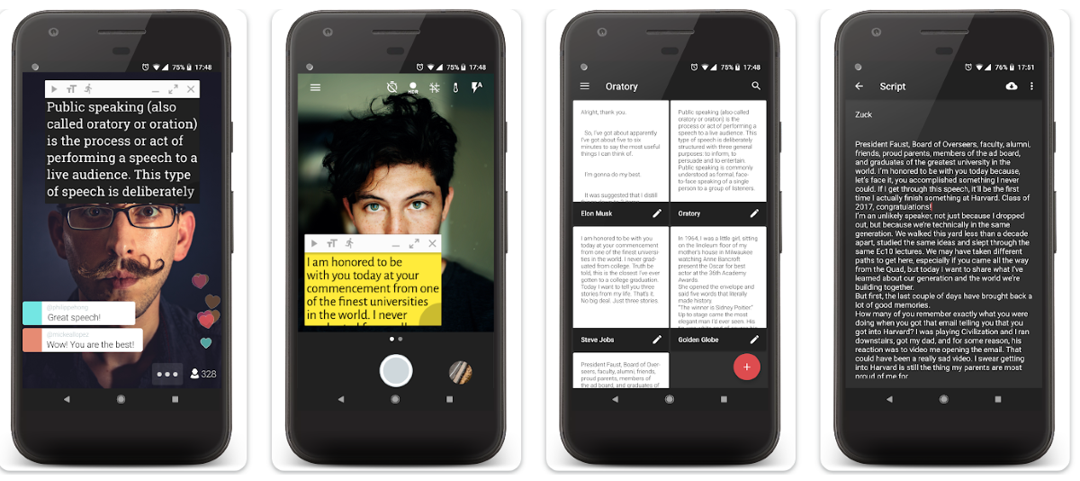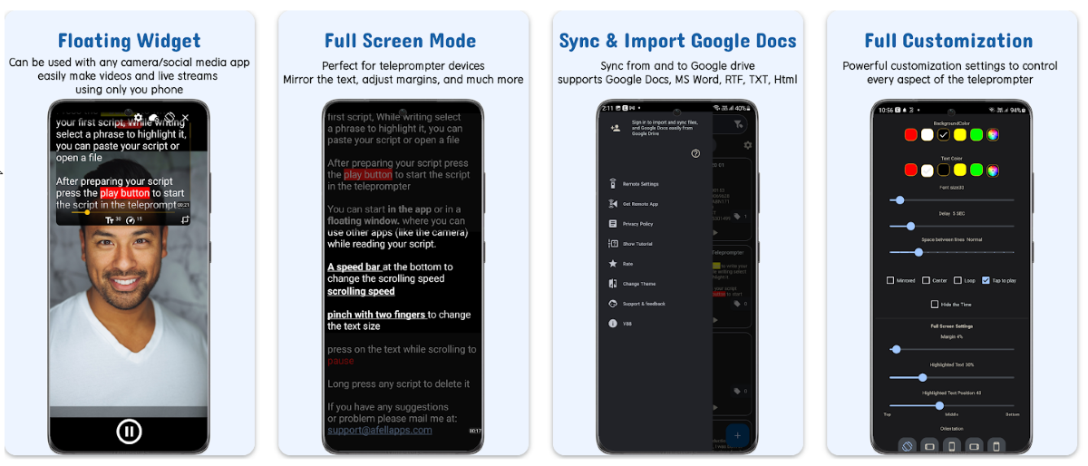 Во многом это приложение похоже на Elegant Teleprompter. Простой интерфейс, в котором легко разобраться. Есть плавающий виджет с текстом, благодаря которому можно записывать видео из любого приложения, импорт скриптов, настройка цветов, управление жестами.
