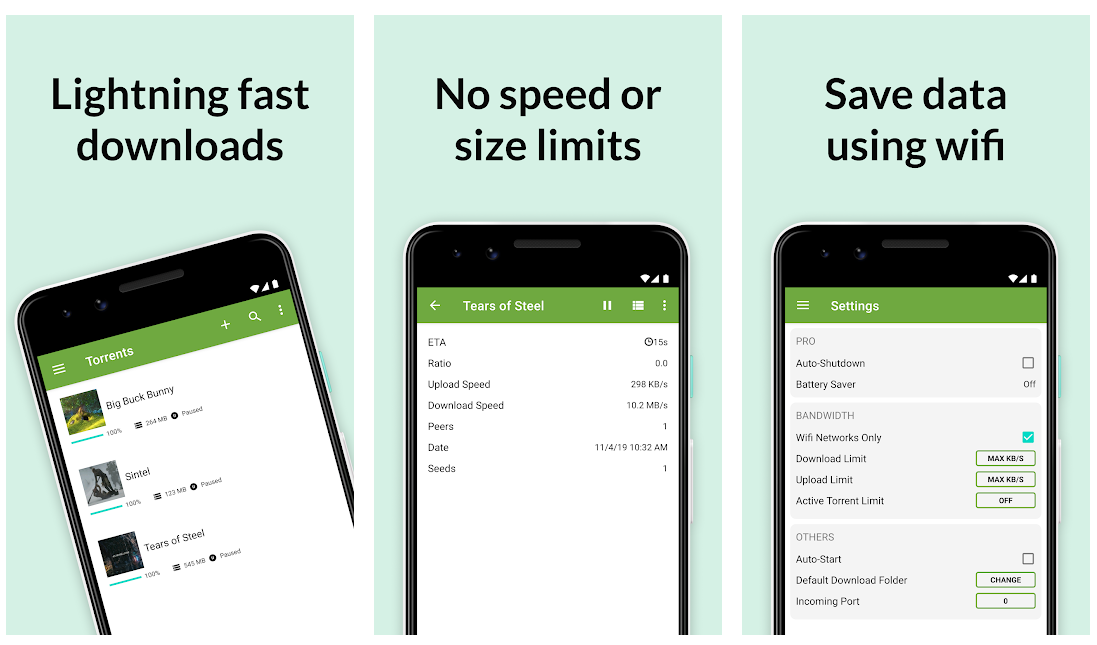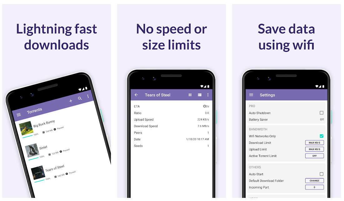 µTorrent — приложение всем известного десктоп-клиента для работы с торрент-файлами. Всё включено: неограниченные скорость загрузки и размер файла, возможность гибко настраивать ограничения на загрузку и передачу, поиск торрентов, подписки RSS, поддержка magnet-ссылок (прямое скачивание без файлов посредников), синхронизация с десктопным собратом, переключение сетей работы (как Wi-Fi, так и мобильная), встроенный плеер, своя медиабиблиотека, локальное сохранение файла, тёмный режим и прочее мелкое. Ну, слушайте, все остальные клиенты мы будем обсуждать, отталкиваясь именно от µTorrent.