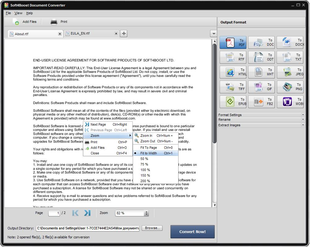 На входе и выходе поддерживаются различные форматы, включая EPUB, AZW3, PDF, MOBI, FB2, DOCX, LIT, LRF, RTF, TXT, TCR, HTMLZ, PDB.