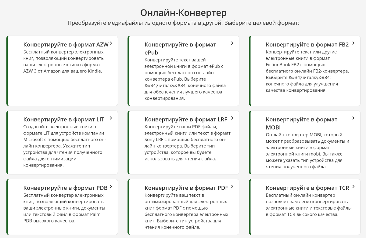 Посредством этих утилит и сервисов вы сможете массово конвертировать электронные книжки из одного формата в другой. Любой из вариантов поддерживает наиболее распространённые форматы: EPUB, PDF, MOBI, LIT, FB2, PDB, LRF, PDB, AZW3 и остальные.