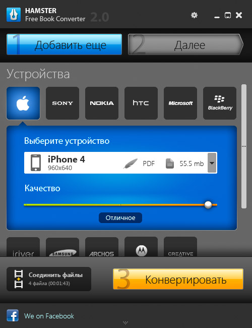 Ещё можно воспользоваться утилитой Hamster eBook Converter. Как видно из названия, её единственная цель — помочь вам с конвертацией книг. Поддерживаются форматы: EPUB, MOBI, LIT, LRF, FB2, PDF, PDB, PRC, TXTZ и остальные. Помимо этого, вы сможете переконвертировать книжку в форматы с учётом устройств. К примеру, Microsoft, Blackberry, Apple iPad, ASUS, Amazon Kindle, CrossElec, boeye, PAGEone, WexLer, Sony PRS-300.
