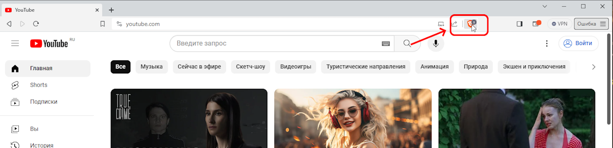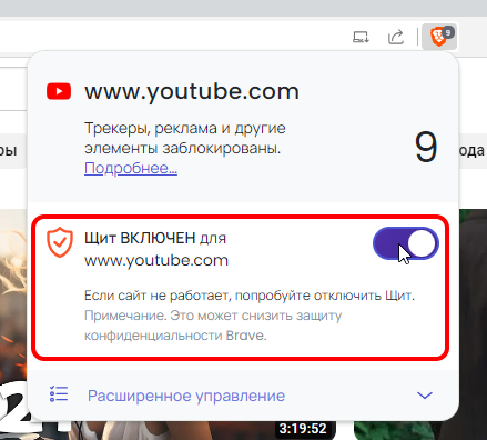 Если вы уже пользуетесь этим браузером, наверняка знаете об этой фишке. Чтобы её настроить, нужно в Brave перейти на сайт YouTube и нажать на значок щита рядом с адресной строкой.