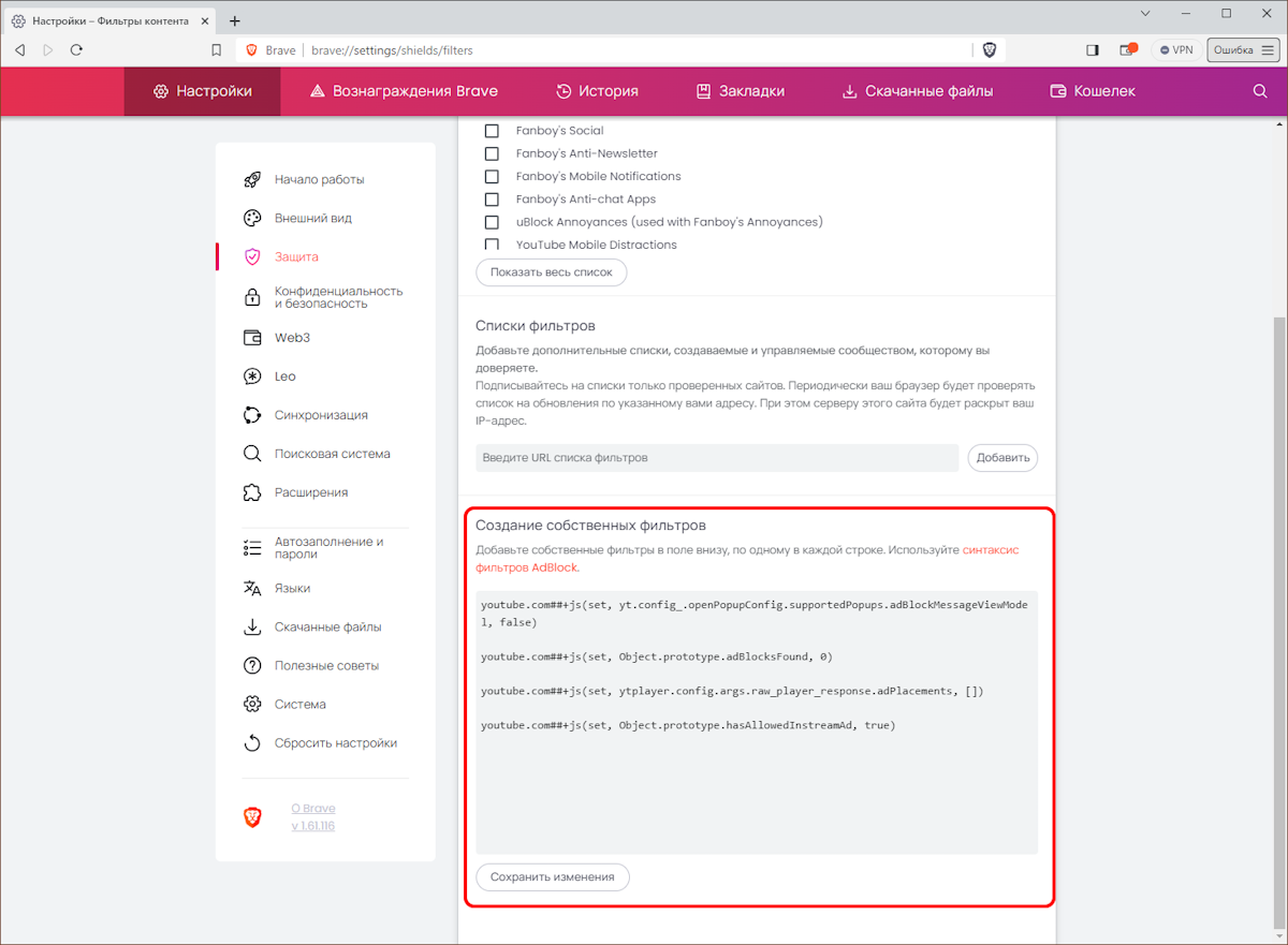 Теперь в браузере перейдите по адресу brave://adblock, и в блоке Создание собственных фильтров вставьте следующий код: