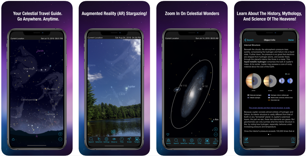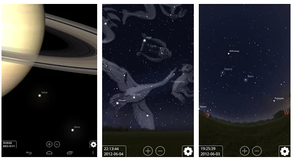 Это простое приложение для просмотра звёзд, созвездий или объектов глубокого космоса является весьма популярным у начинающих астрономов-любителей. Бесплатное приложение с поддержкой рекламы (в iOS называемое «Lite») показывает Солнце, Луну, планеты Солнечной системы, 88 созвездий и более 8000 звёзд, а также другие известные объекты глубокого космоса. Местоположение пользователя либо определяется автоматически через GPS, либо задаётся вручную. Вы можете скрыть все меню, войти в режим «AR-track», а затем направить своё устройство к небу.