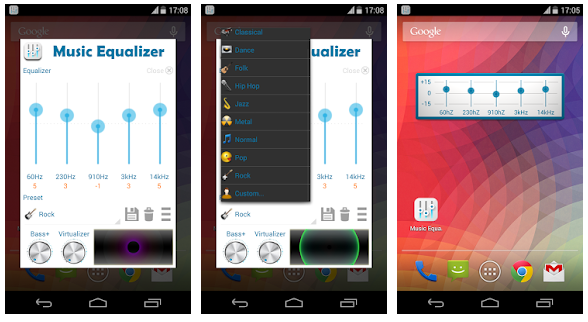 Это один из наиболее простых эквалайзеров для Android, имеющий 5 полос и функцию усиления басов. Кроме того, в приложение входят 10 готовых предустановок, темы, виджеты и добавочные компоненты для управления уведомлениями. Интерфейс эквалайзера простой и интуитивно понятный. Усилитель низких частот и другие функции справляются со своими задачами хорошо.
