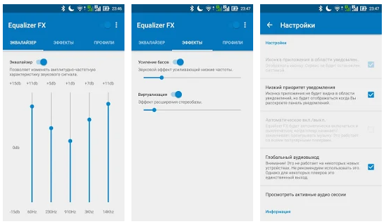 Equalizer FX является более современным приложением с очень простым интерфейсом и эквалайзером на пять полос. Имеет функцию усиления басов, виртуализацию, виджет, а для операционной системы Android 4.4 и выше доступен усилитель громкости динамиков. Предусмотрен также набор пресетов.