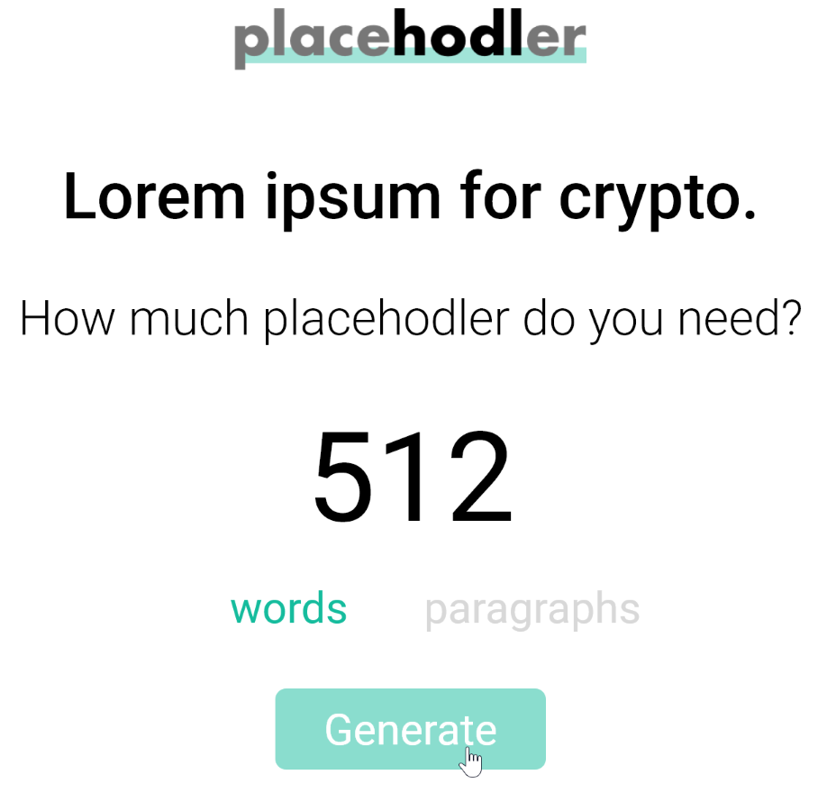 Ещё один интересный генератор рандомного текста, который понравится тем, у кого есть сайт, связанный с криптовалютой. Вам лишь нужно указать необходимое количество слов или абзацев, чтобы Placehodler сгенерировал текст-заполнитель на криптовалютную тематику.