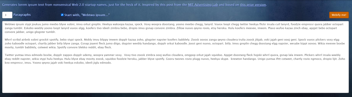Генераторы случайного текста могут понадобиться для заполнения веб-страниц разработчикам ПО или стартаперам. И Web 2.0 подходит для этого как нельзя лучше. Этот инструмент может создавать как внятный, так и бессмысленный текст с названиями всяких стартапов и айтишными терминами.