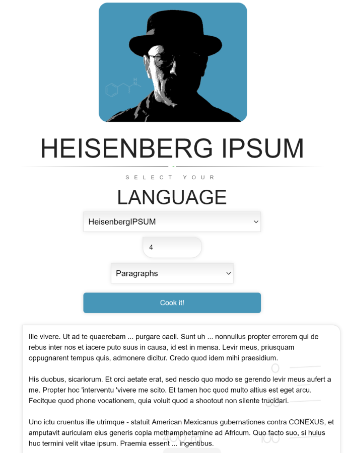 Если вы, как и я, без ума от Уолтера Уайта и других героев сериала, вы просто обязаны попробовать этот крутой инструмент. С ним вы сможете выставлять автоматом количество генерируемых абзацев, слов или символов, но не предложений — они устанавливаются вручную. Но даже этот маленький минус не уменьшает моего щенячьего восторга!