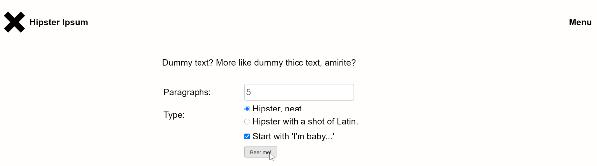 С его помощью вы сможете сгенерировать хиповый текст в один клик. Дизайн сайта выполнен в стиле минимализма — на чисто-белом фоне расположился незамысловатый функционал. Вам будет предложено выбрать нужное количество абзацев, а также один из трёх типов генерации. Чтобы запустить генератор, нужно нажать кнопку Beer me (Пива мне). Пива вам, конечно же, не принесут, но тексты в стиле рэп-лирики я вам гарантирую!