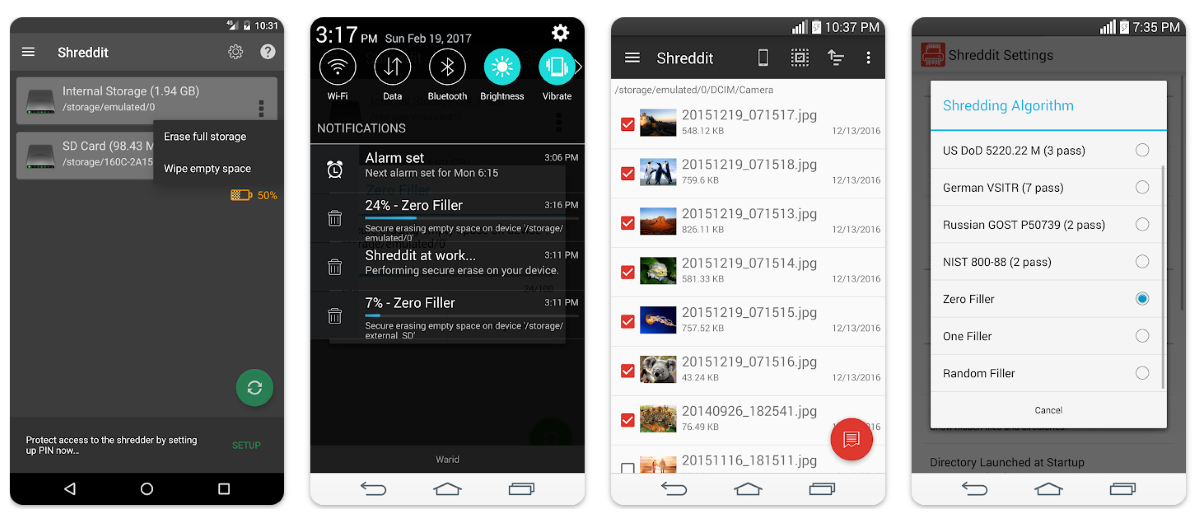 Предлагается 7 технологий очистки, включая американский DoD 5220.22-M, немецкий VSITR, Random Filler, One Filler и NIST 800-88. Большинство из них должны корректно работать на обновлённых версиях ОС Android.