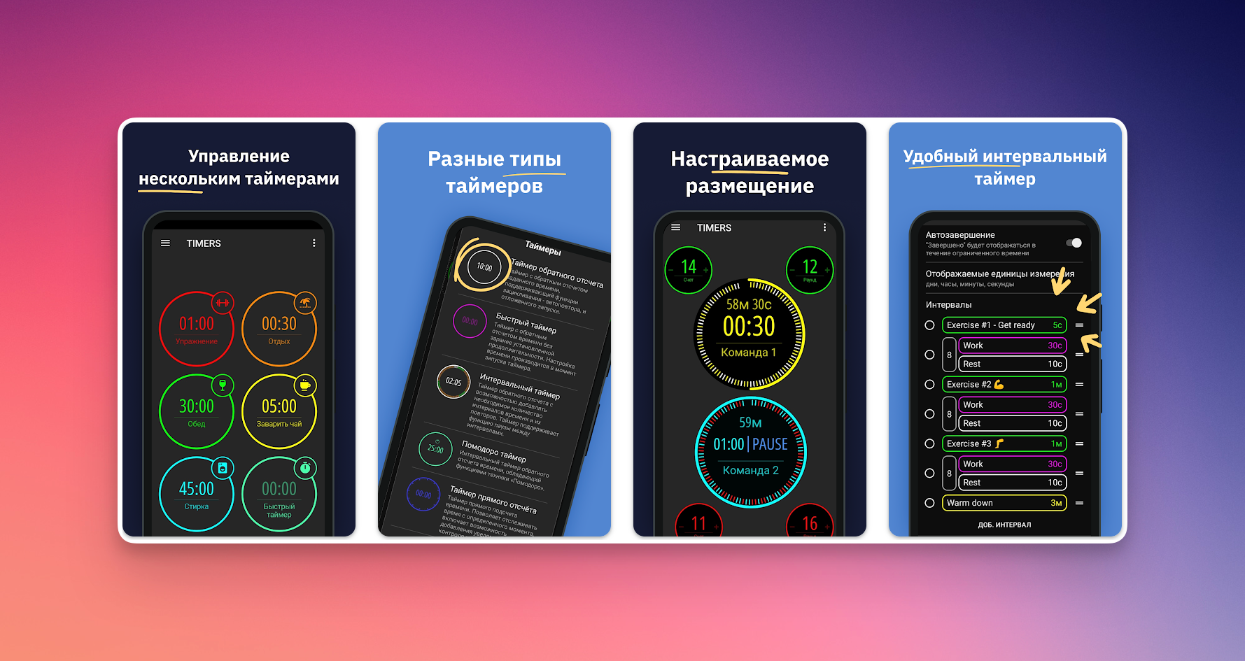 Простое приложение с различными таймерами для разных задач. Например, есть таймер с обратным отсчётом времени, есть для подсчёта времени с определённого момента, интервальный (позволяет устанавливать повторяющееся с определённым интервалом время), Pomodoro и т.д. Вы можете указать название, выбрать цвет и иконку для каждого таймера.