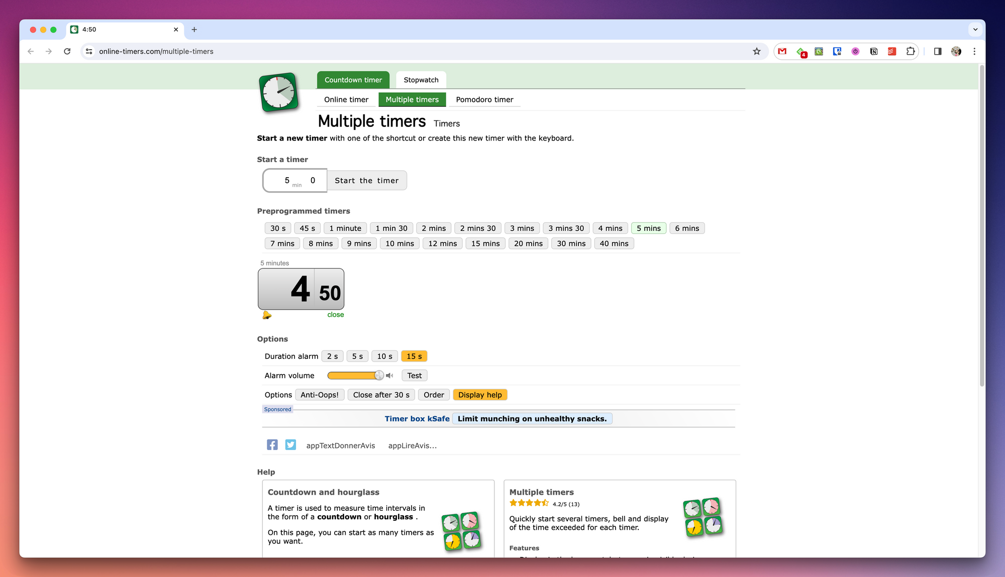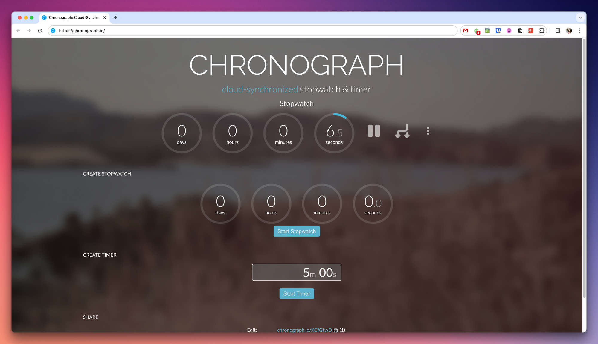 Онлайн-сервис, позволяющий устанавливать несколько таймеров и синхронизировать их на любом устройстве. Интерфейс максимально простой: нажимаете Create Timer, вбиваете время и давите на Start Timer.
