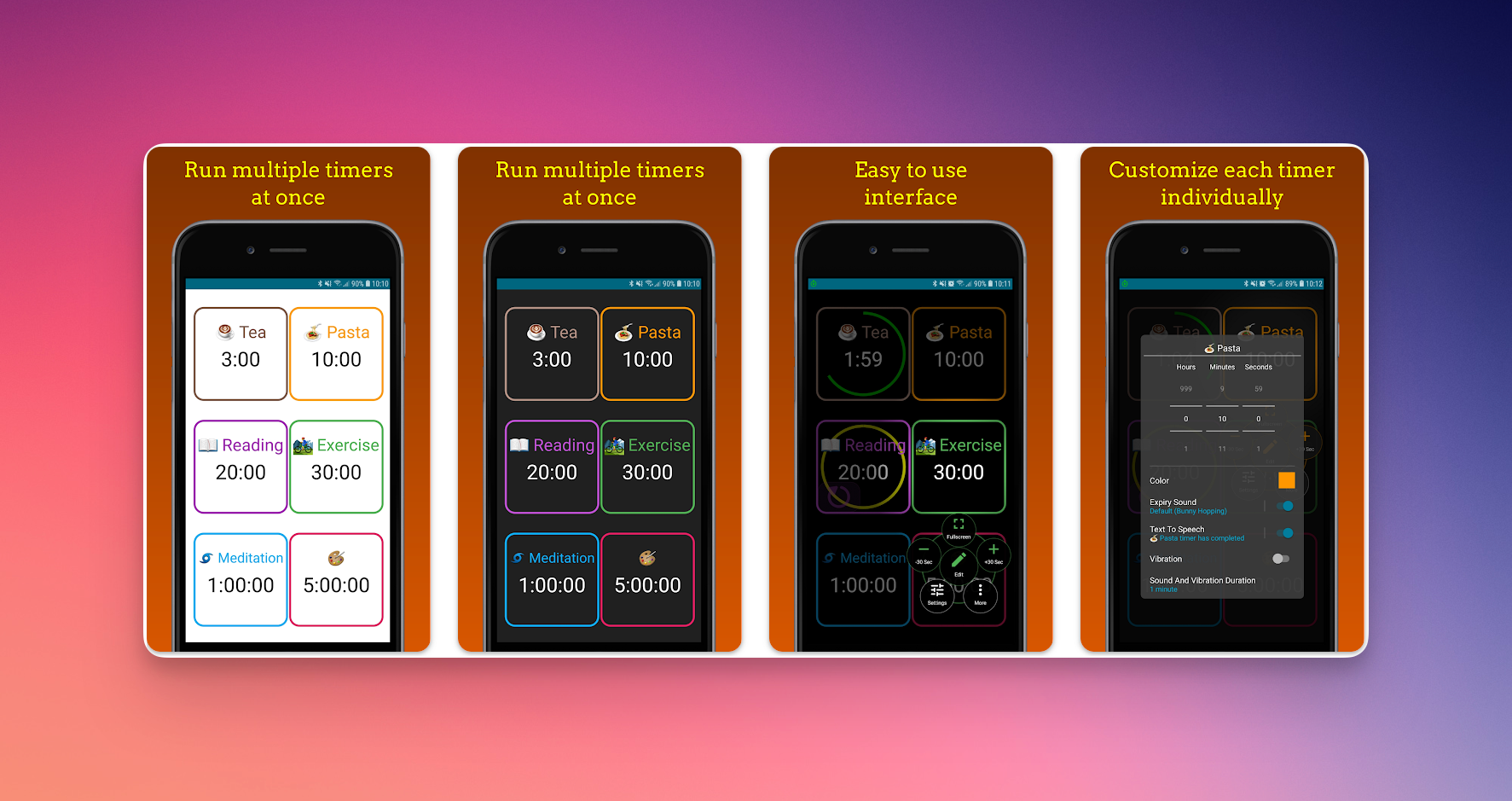 Приложение с простым интерфейсом и лёгким доступом ко всем необходимым функциям таймера. Вы можете установить несколько таймеров и настроить их по своему усмотрению (поменять цвет, включить или отключить вибросигнал и т.д.).