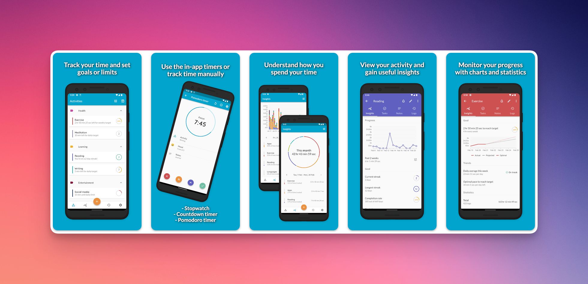 Мобильное приложение для отслеживания целей и управления временем. Вы можете ставить несколько таймеров для различных целей и следить за их выполнением (есть отдельная вкладка, где будет отображаться ваш прогресс и общая статистика).