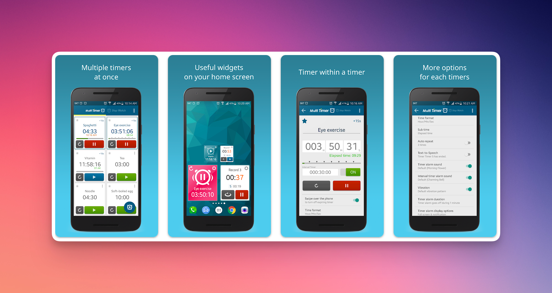 Ещё одно приложение с таймерами. Вы можете разместить таймеры в виде виджетов на главном экране или следить за их состоянием из панели уведомлений. Также можно настроить каждый таймер под свои задачи, изменить их порядок простым перетаскиванием. А ещё приложуха хранит всю историю созданных таймеров.