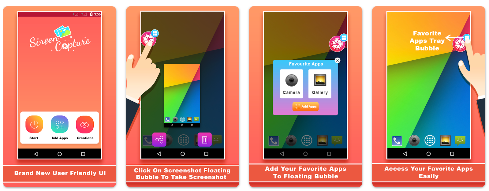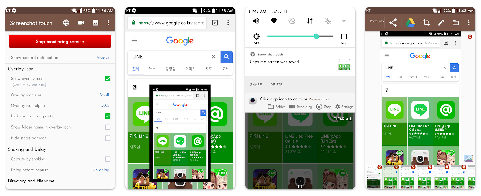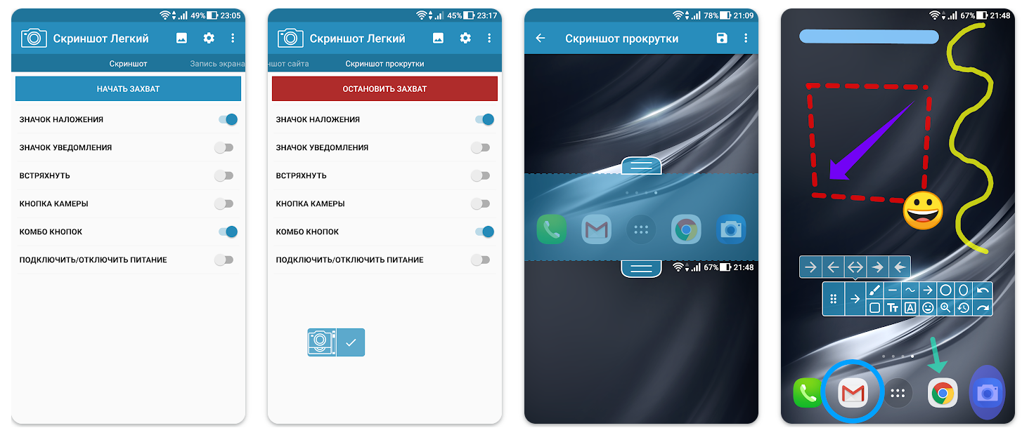 Такой же, как Screenshot Touch, только с более удобным интерфейсом. Вверху есть четыре вкладки, которые помогут сделать обычный скриншот, запись видео с экрана, скриншот веб-страницы и скриншот с прокруткой.