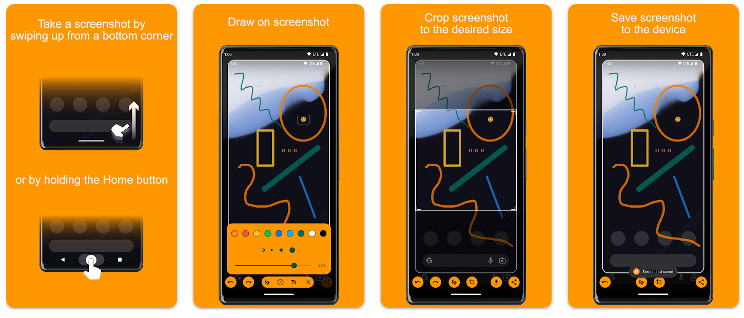 Очень простой в использовании скриншотер. Но для начала нужно будет сделать его используемым по умолчанию и немного настроить. Чтобы сделать снимок экрана, достаточно нажать и удерживать кнопку Home (тот самый кружочек или квадратик внизу телефона) или провести пальцем вверх от угла экрана. Сразу после этого вам будет предложено обрезать или аннотировать этот скриншот.